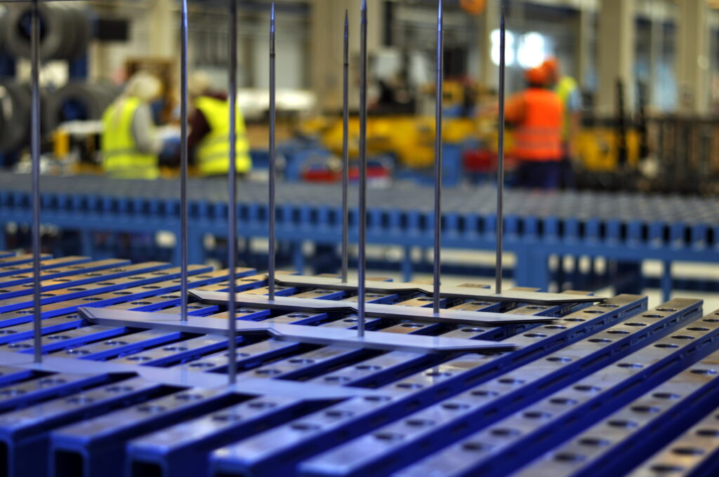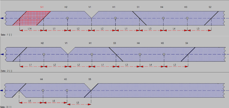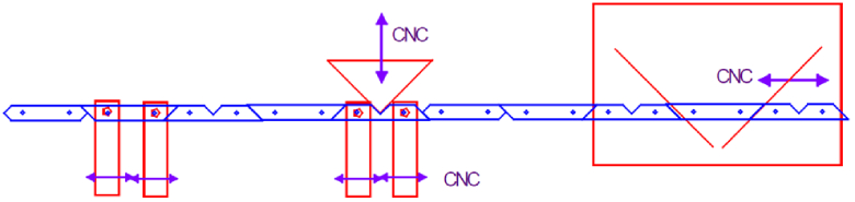 Plech prochází přes dva páry děrovacích kleští, každý pár razí díry do jednoho dílu o průměru 10 mm pro vyrovnání ve stohu. Všechny děrovací kleště jsou pohyblivé v podélném směru, ovládané jsou servomotorem. Mezi druhým párem kleští je nástroj pro střihání V-výseče. Tato výseč je tvořena uprostřed jha pro spojení s prostředním sloupkem. Nástroj pro V-výseč je pohyblivý v příčném směru s plechem, aby mohl měnit svou polohu pro tvorbu překrytí step-lapu. V-výseč je také uplatněna úplně na konci sekvence na středním sloupku pro dosažení požadovaného tvaru jeho konce. Jednotlivé plechy jsou pak od sebe odděleny dvěma nůžkami), které s krajem plechu svírají 45° a mezi sebou 90°. Rozložení nástrojů v lince je na obr. 4.