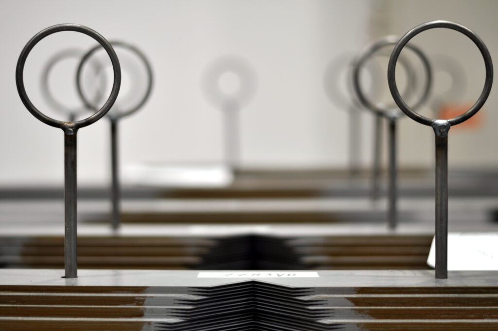 Vyseknuté plechy jsou pásovým dopravníkem transportovány nad stohovací vozík. Horní plocha vozíku se skládá ze svařovaných obdélníkových ocelových trubek, které jsou rovnoběžně uspořádány, příčně ve směru pohybu plechů. Rozteč trubek je 100 mm a stejnou rozteč v příčném směru v nich mají i díry pro umístění srovnávacích kolíků (proto musí být vzdálenost mezi dírami v plechu celočíselný násobek 100 mm). Kolíky musí být manuálně namontovány na pozice, které vyžadují rozměry daného designu vysekávaných plechů.