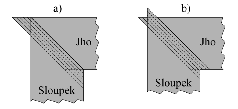 Obr. 7. Rozdíl rohového spoje dvou paketů a) Nejširší stupeň b) Ostatní stupně