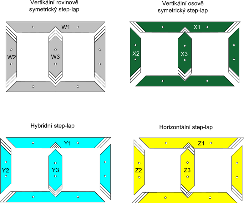 - Vertikální osově symetrický step-lap – Jho má jednotný krok na všech svých spojích, avšak obě jha jsou s opačným krokem. Vrstvy sloupků jsou pak všechny stejně dlouhé, rozdílná je jen poloha vyrovnávacích děr (viz. 9b).