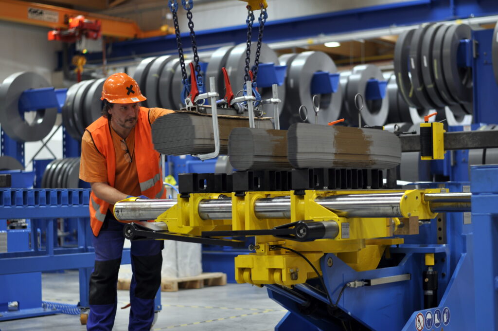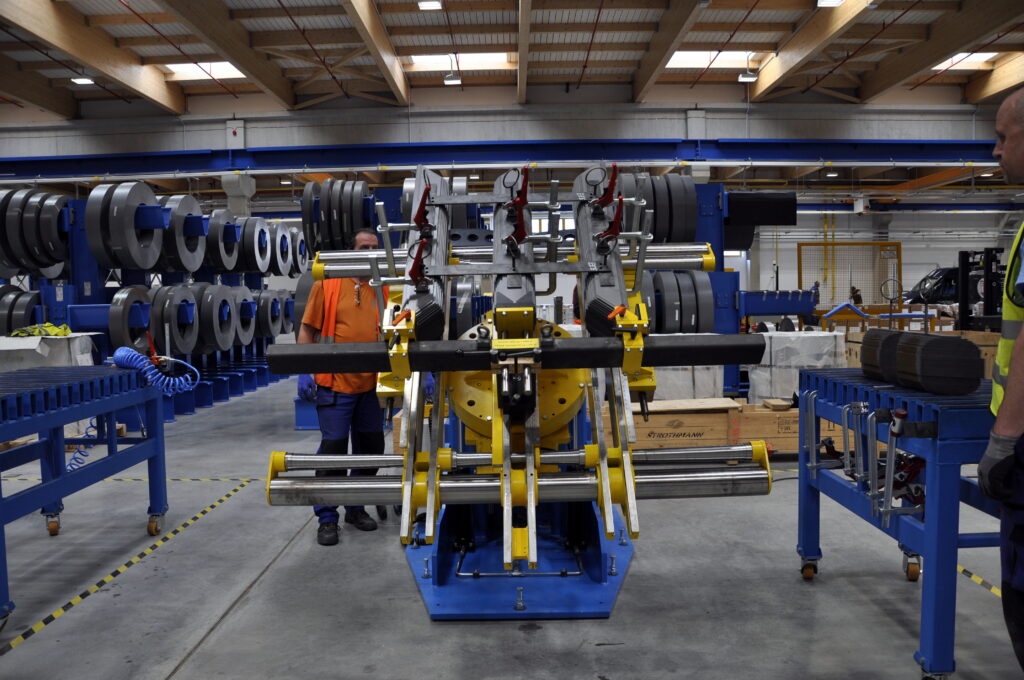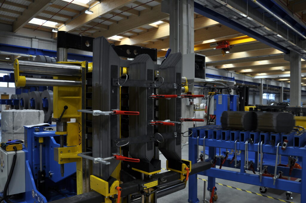 Celý proces skládání začíná už na stohovacím vozíku, kde se využívá už správně seskupených plechů jednotlivých sloupků a jeh. Srovnávací kolíky jsou vyměněny za jiné vhodné pro přenos celých sloupků, které tak mají zafixovaný tvar. Vyjmutí sloupků se provádí jeřábem.