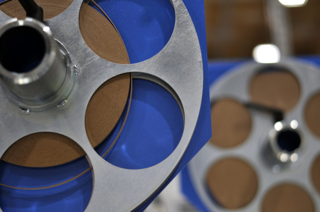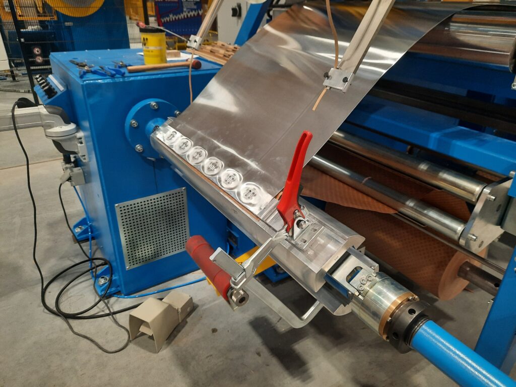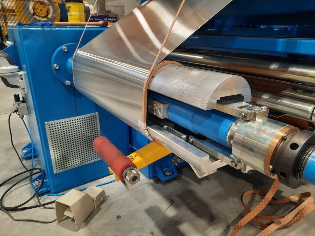 Další dva odvíječe, tentokrát pro okrajovou izolační pásku, se nacházejí nad jednotkou na úpravu fólie. Oba systémy je možno posouvat ručně do stran za účelem přesného nastavení vzhledem k hranám fólie. Pásky jsou na vinutí přiváděny naklápěcími rameny.