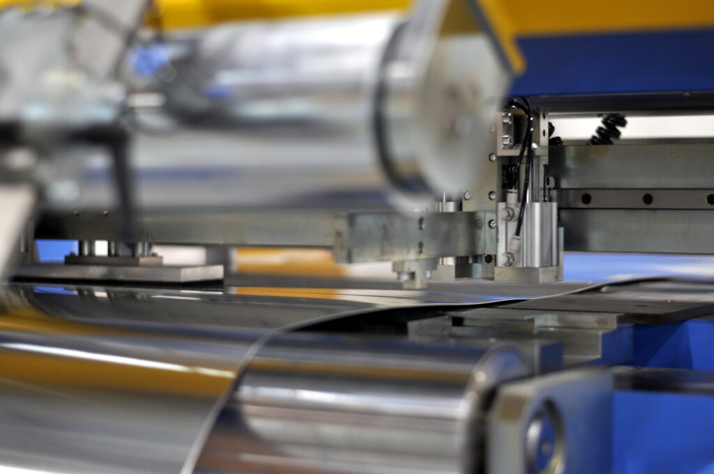 Z odvíječe fólie nejprve pokračuje na jednotku pro odstranění otřepů na hranách fólie. Na obě hrany jsou přitisknuty dva válečky, které jsou pneumaticky ovladatelné a všechny přečnívající otřepy zarovnávají.
