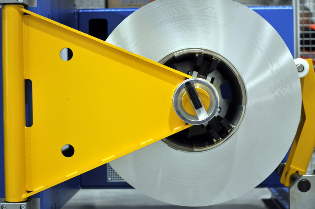 Ze skříně pokračuje ručně rozpínací trn, na který se nakládá svitek vodiče. Mechanický rozpínací systém umožňuje rychlé a snadné naložení na odvíječ. Aby bylo možné používat vysoké napnutí fólie bez jakéhokoli posunutí vodivé fólie na trnu do strany, je povrch čelistí plně vroubkovaný. Odvíječ se může nakládat jeřábem, poté je trn podpořen výkyvným protiložiskem.