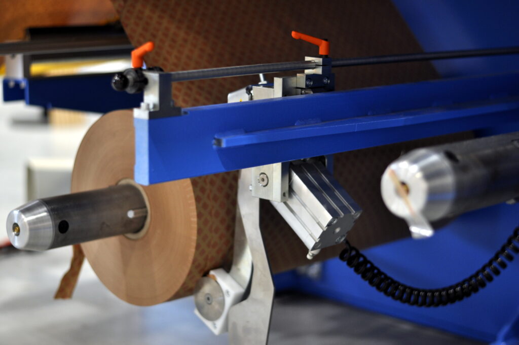 Pod jednotkou na úpravu fólie se nachází rozpínací trn pro naložení role izolačního papíru. Je zde stupnice umožňující přesné nastavení hran, zde se také dá nastavit nůž, který při odvíjení odřezává hranu papíru pro dosažení požadované šířky, jelikož se role vyrábějí jen ve standardizovaných šířkách, viz obr. 6. Výhodou je značné zredukování naskladněných šířek izolačních papírů. Napínání papíru je zajištěno pneumatickou kotoučovou brzdou, která je regulovaná senzorem měřící průměr role. Stroj může být vybavený i více odvíječi izolace.